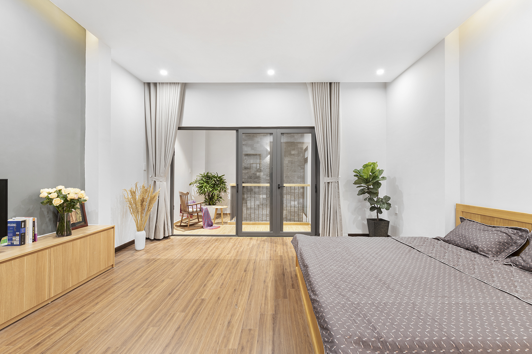 Căn nhà được bổ sung các ô thông tầng để tăng cường gió và ánh sáng cho hành lang giữa nhà. Giếng trời sẵn có ở cuối nhà được tận dụng lại và mở rộng, đẩy lùi phòng ngủ vào trong. Giếng trời kết hợp cùng khu vệ sinh thành khoảng không gian thoáng đãng, nhiều ánh sáng và gió. Cây xanh ở giếng trời, hành lang, sân trong, ban công và sân thượng giúp gia chủ cảm nhận được thiên nhiên ở khắp nơi.